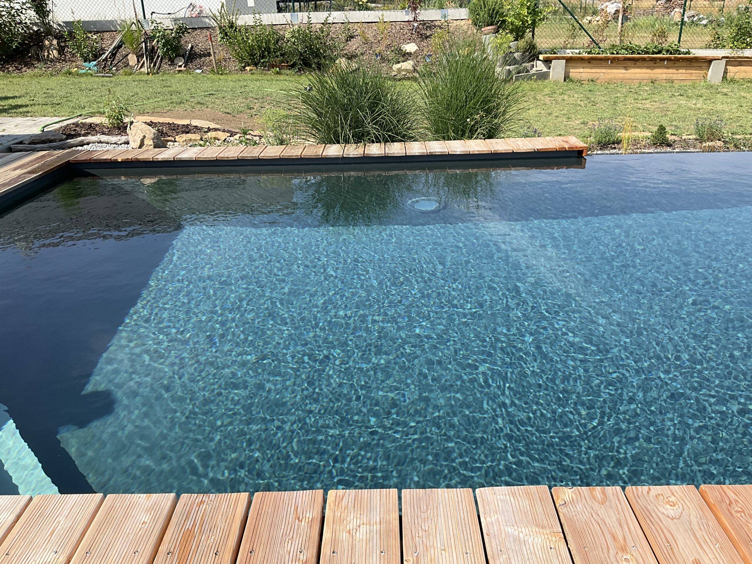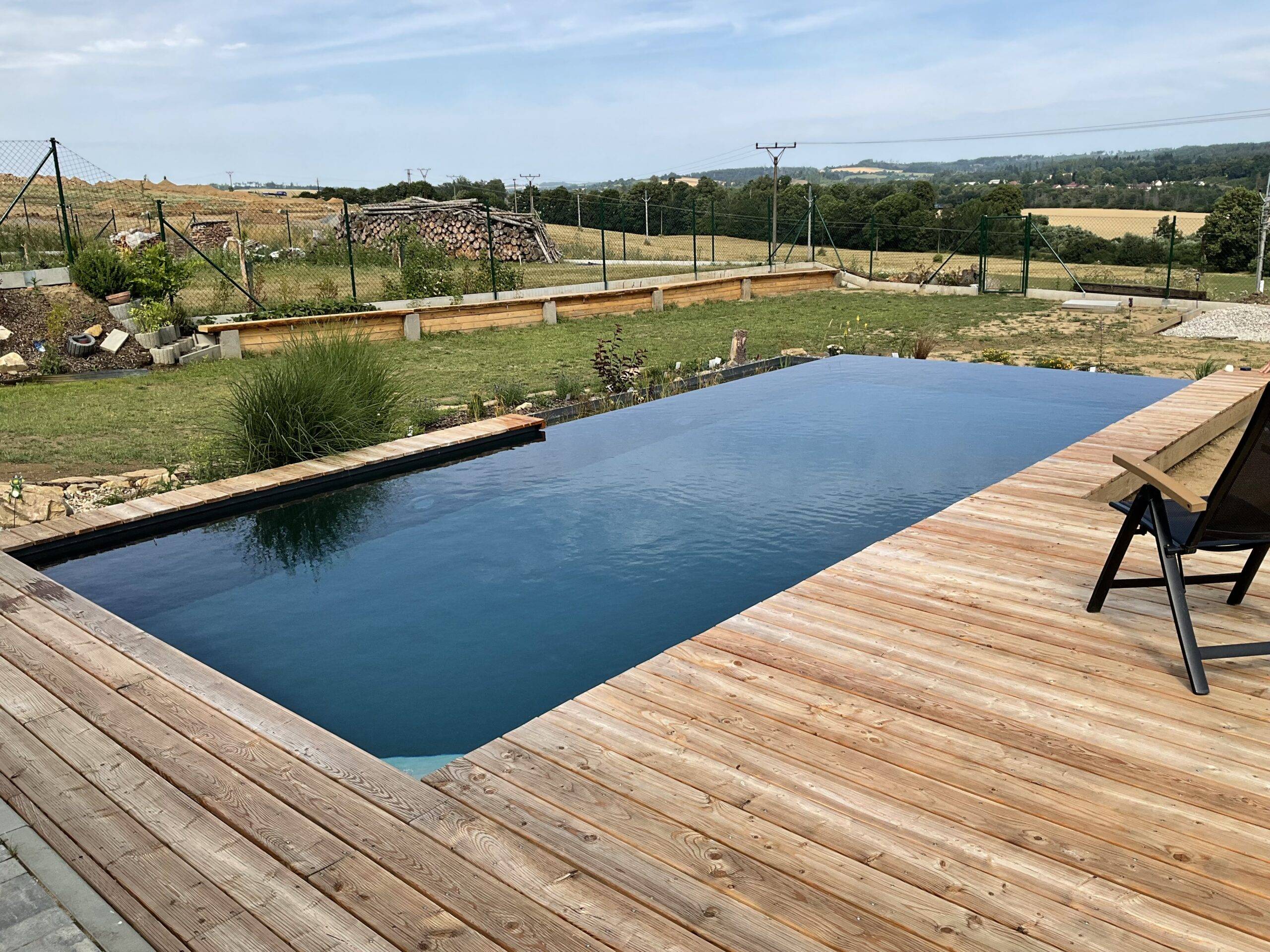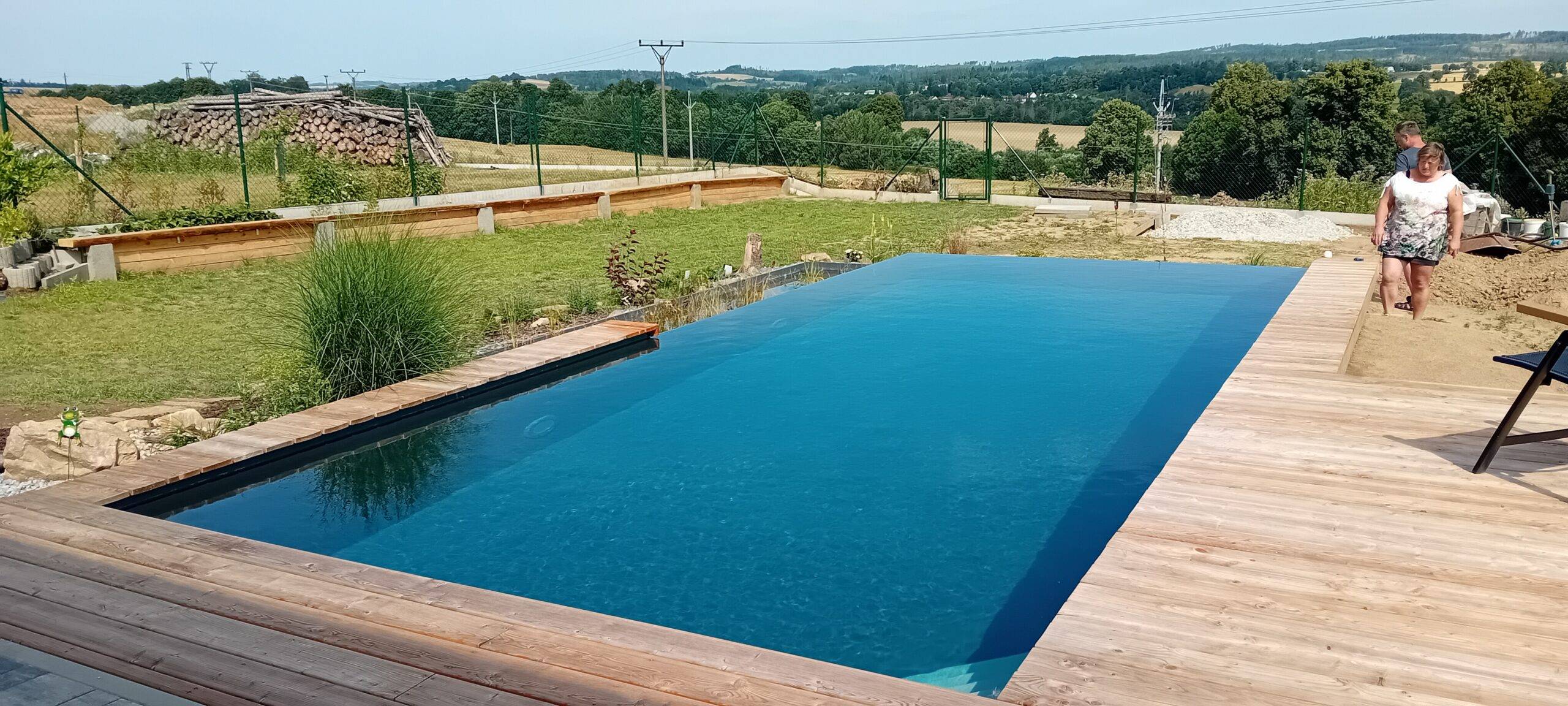 V tomto případě se jednalo čistě o realizaci přírodního bazénu a terasy. Zahradu si investor pak zhotovil svépomocí. Výhled do krajiny a svahovitá zahrada? Řešení přelivovou „ztracenou“ hranou se nabízelo samo.