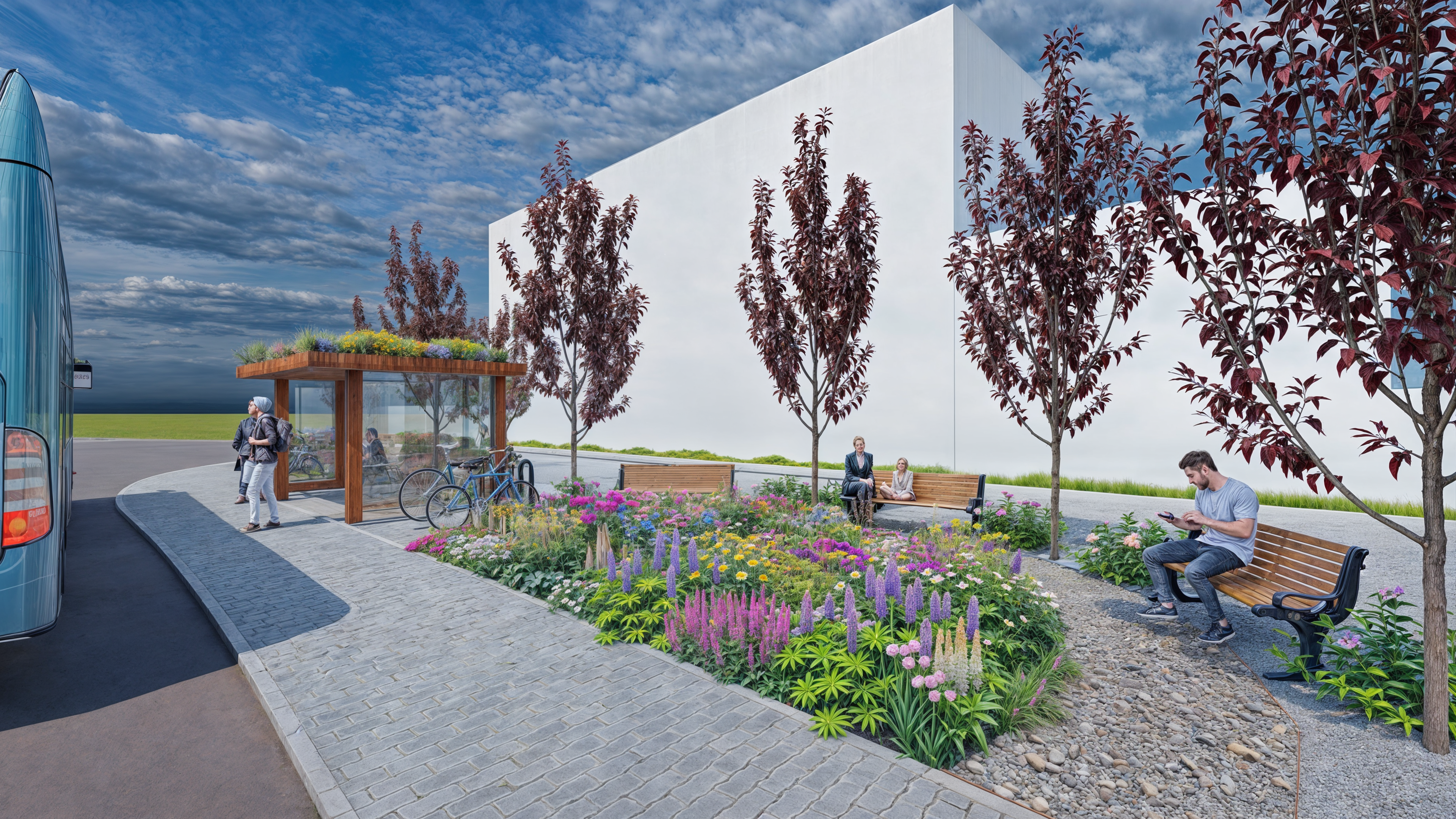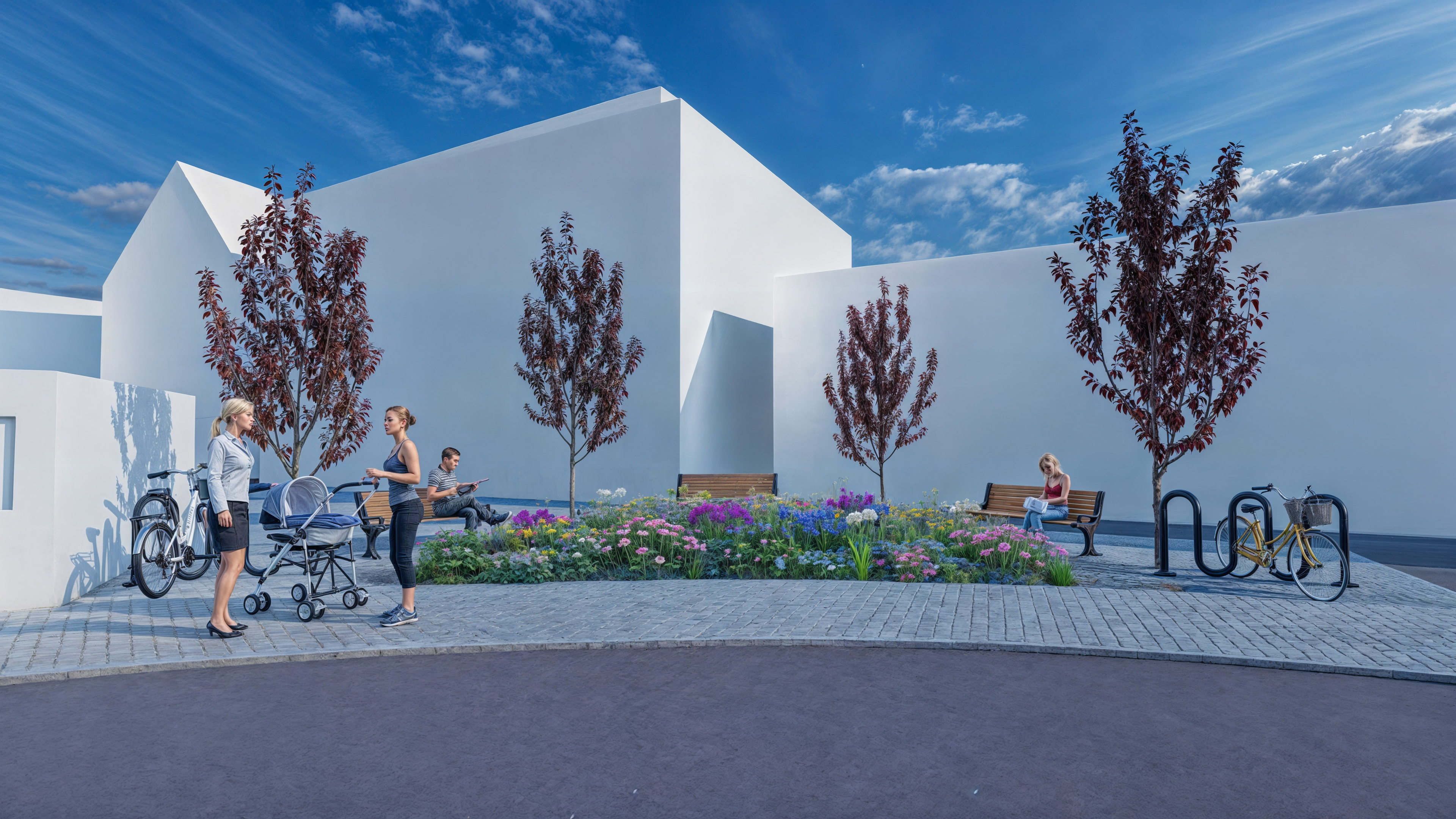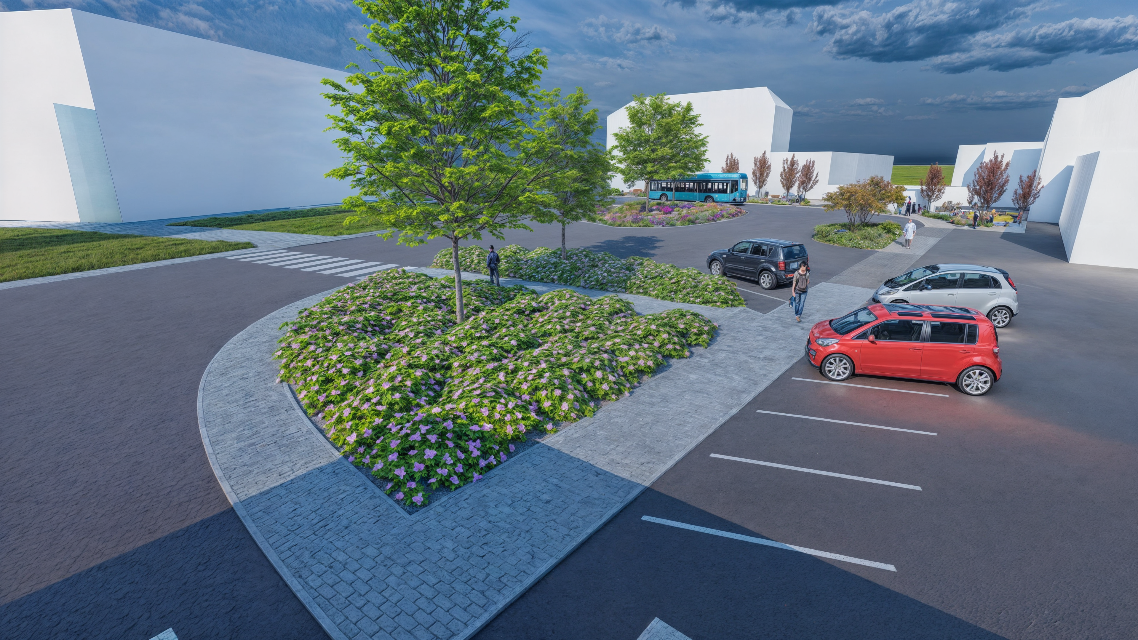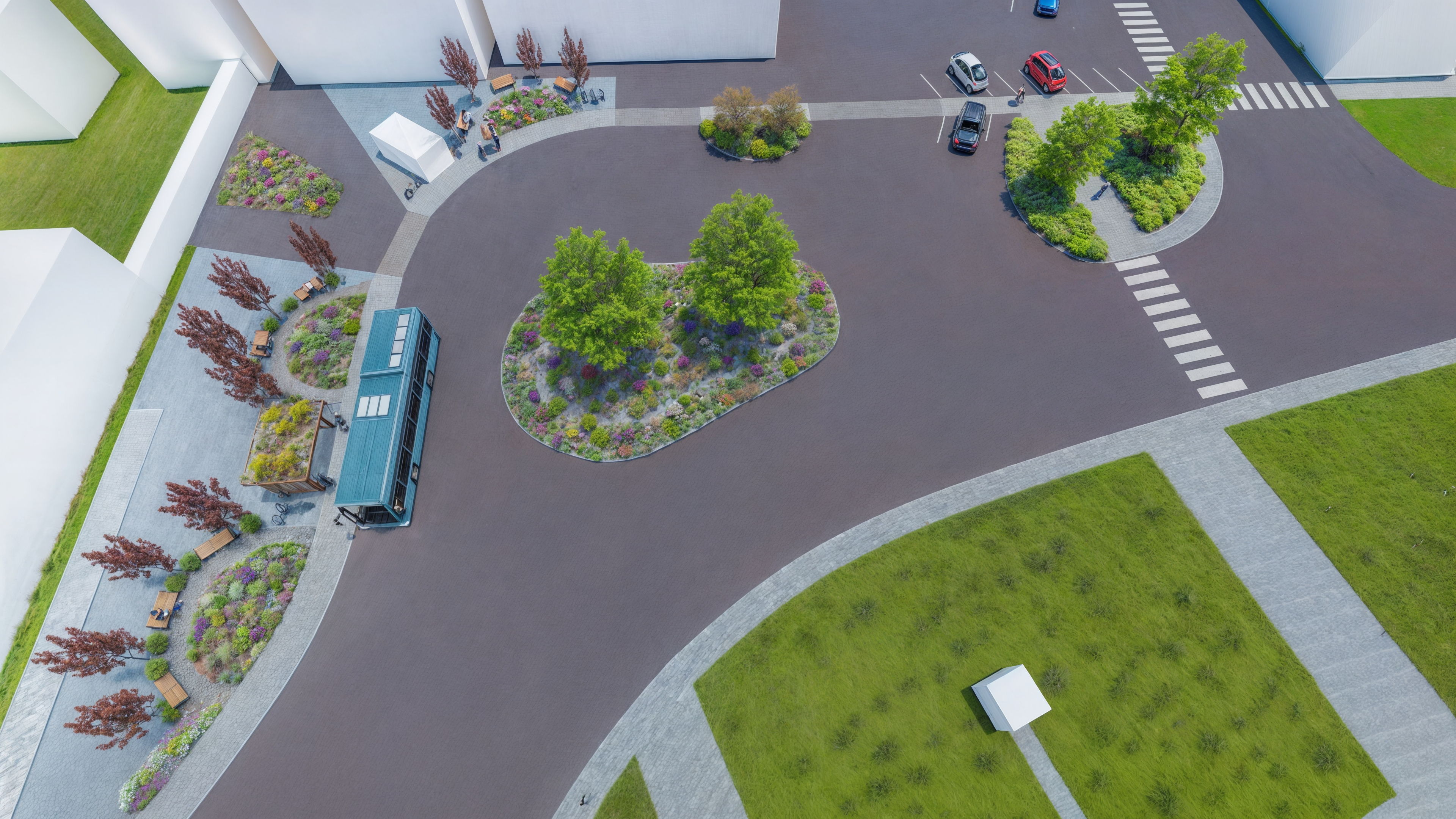 Návrh kompletní revitalizace veřejného prostoru v centru Větrného Jeníkova řeší celkově modrozelenou infrastrukturu místa. Kromě zeleně, konkrétně dešťových záhonů, je zde navrhovaná dopravní infrastruktura – točna pro autobusy a mobiliář včetně zastávky.
