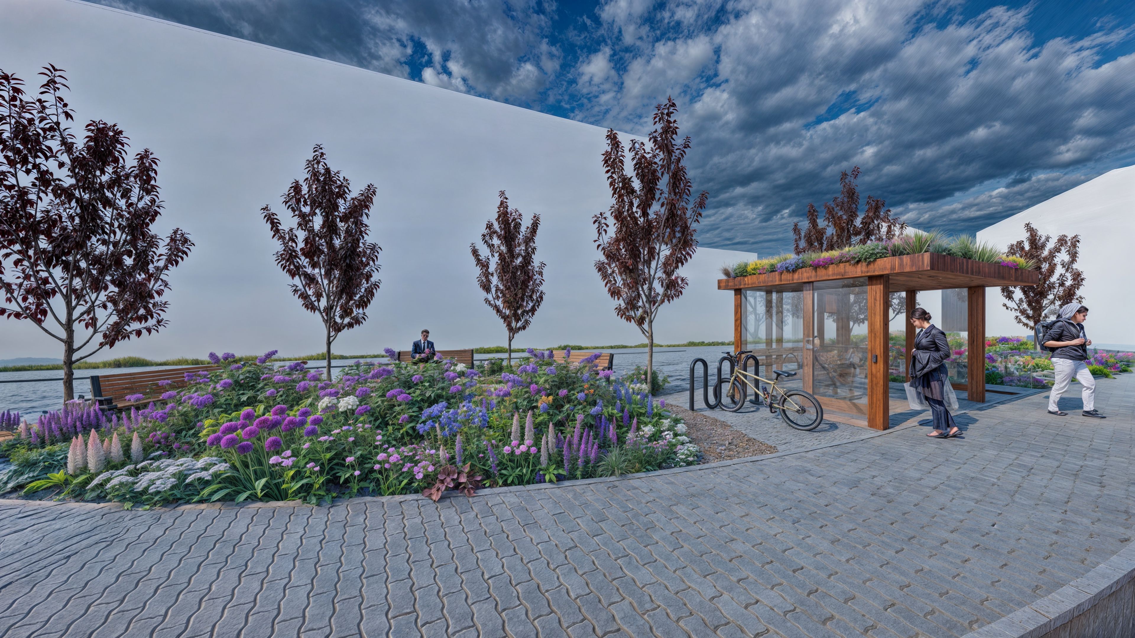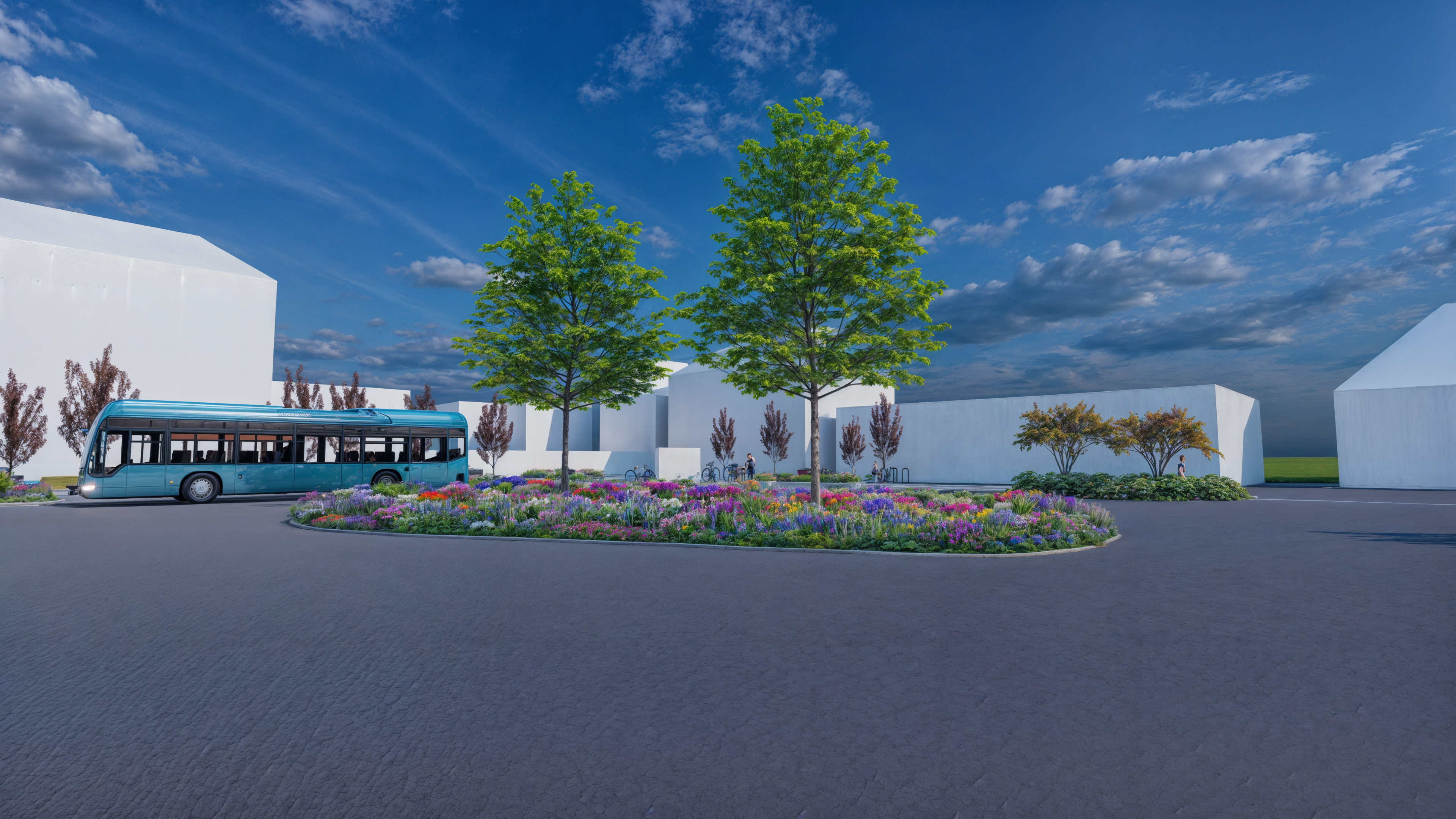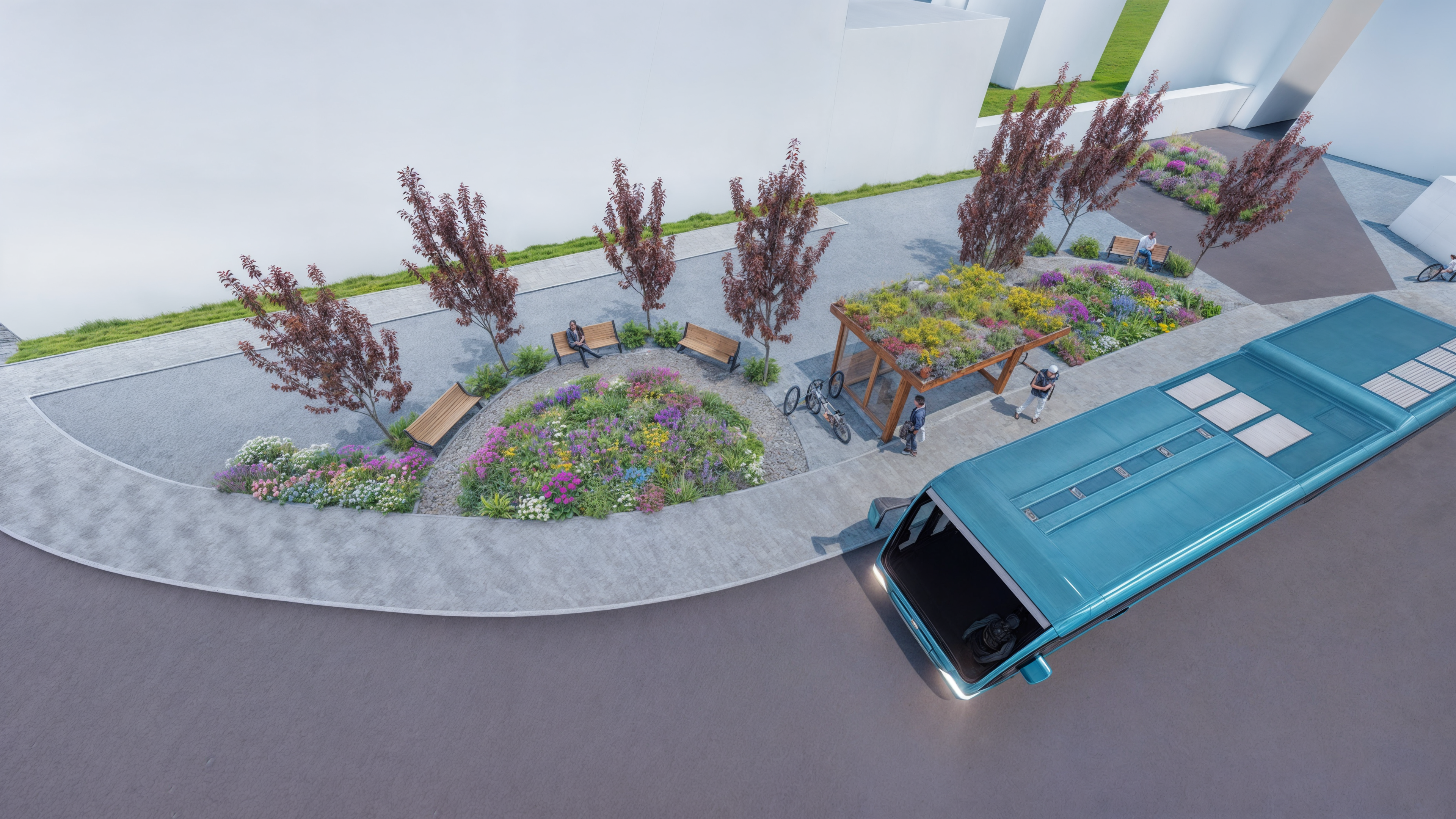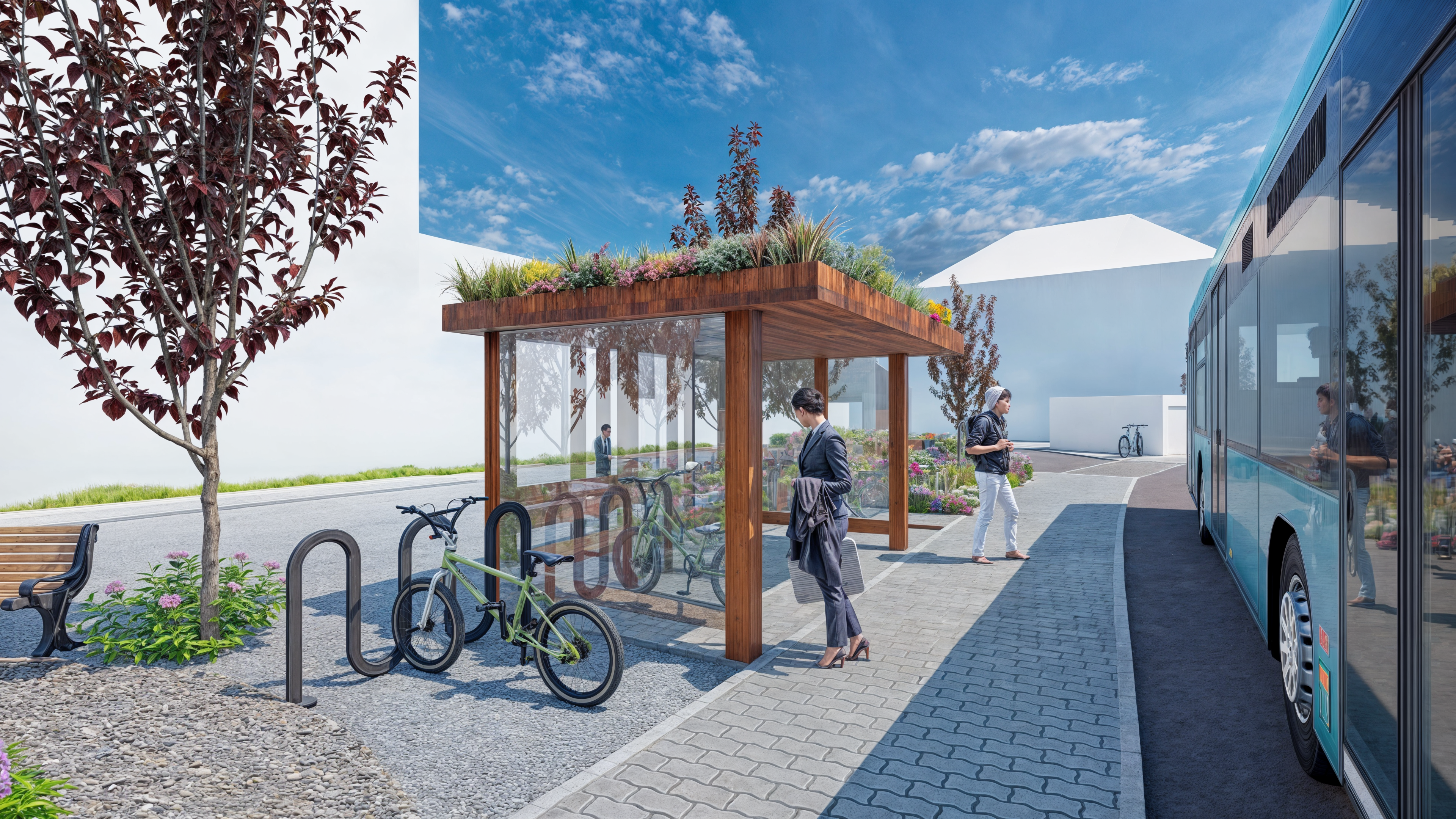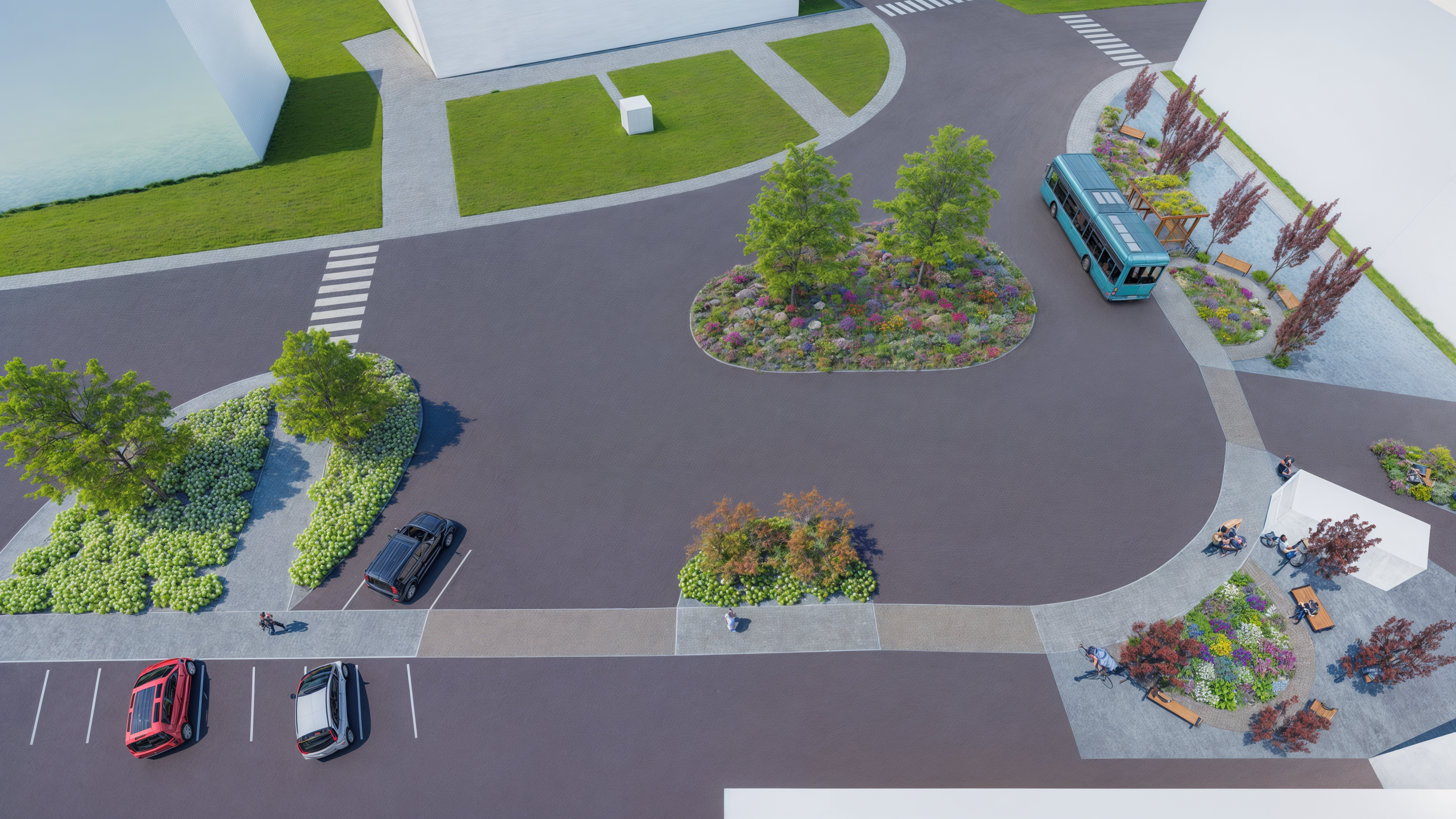 Návrh kompletní revitalizace veřejného prostoru v centru Větrného Jeníkova řeší celkově modrozelenou infrastrukturu místa. Kromě zeleně, konkrétně dešťových záhonů, je zde navrhovaná dopravní infrastruktura – točna pro autobusy a mobiliář včetně zastávky.